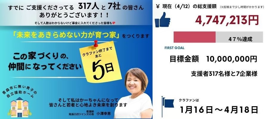 24年間にわたり看護師としてさまざまな医療の現場に立ち、3人の男子の母としても発達障害のあるお子さんの子育てと向き合ってこられた小澤さん。今、青森市にまだない「男子の自立援助ホーム」をつくるため、クラウドファンディングに挑戦されています。